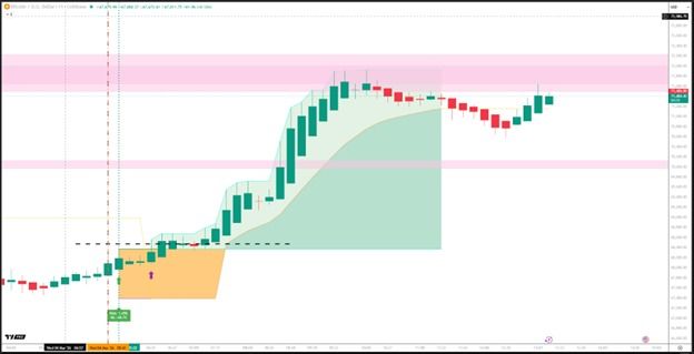 Final Outcome: Bitcoin surged to $72,000 before the system identified a loss of momentum and closed the trade. The total gain? A staggering $2670 gain.