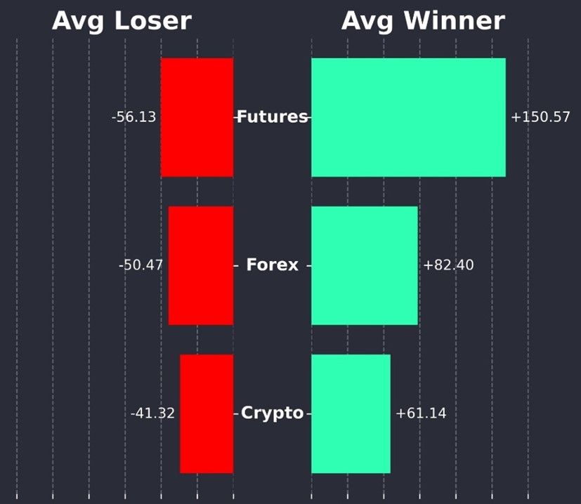 Futures: The average winner is 150 ticks, while the average loser is 56 ticks.