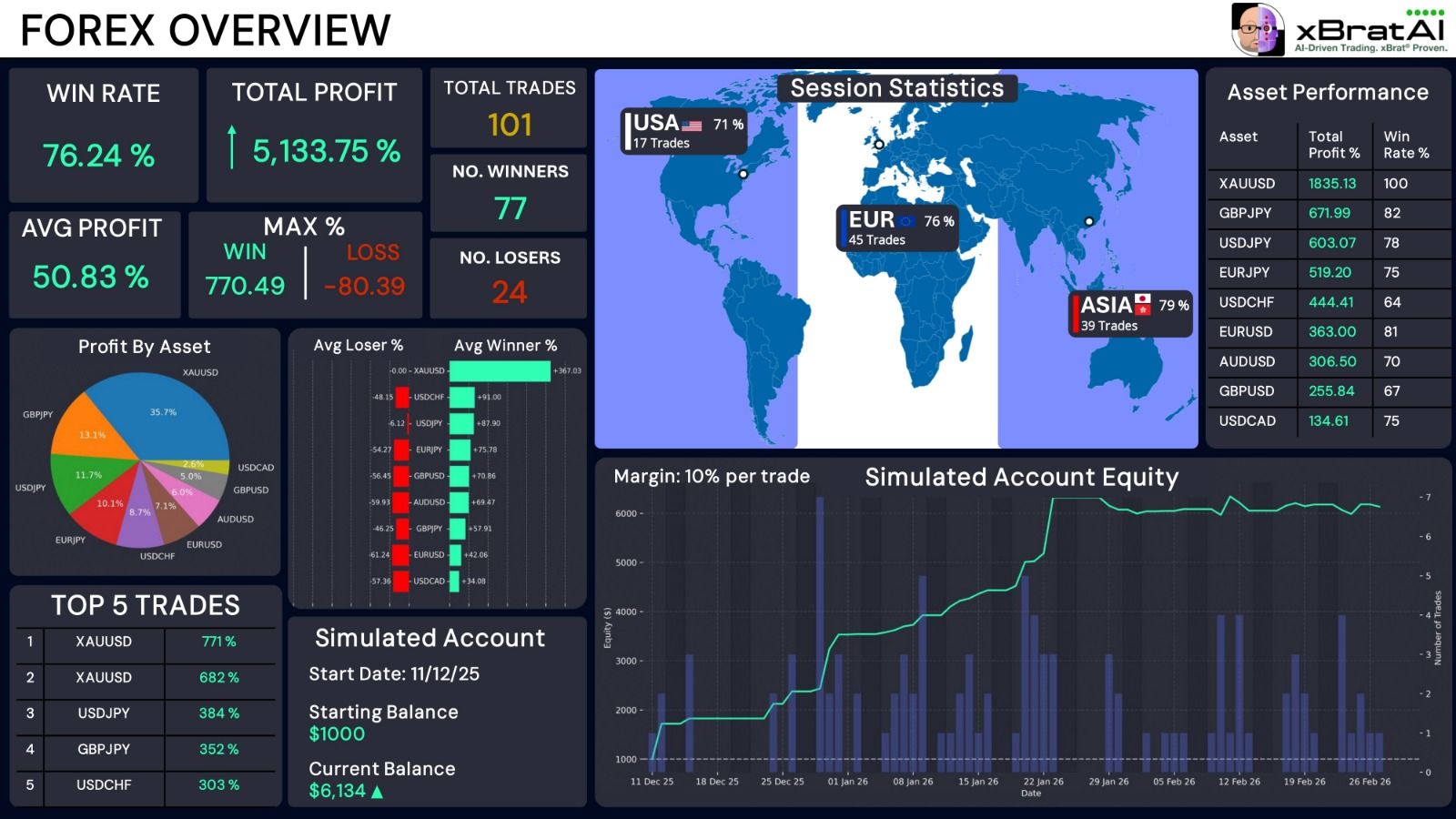 Forex completed 101 trades with a 76.24% win rate and 5,133.75% total profit. A simulated $1,000 account reached $6,134 as trade count expanded.