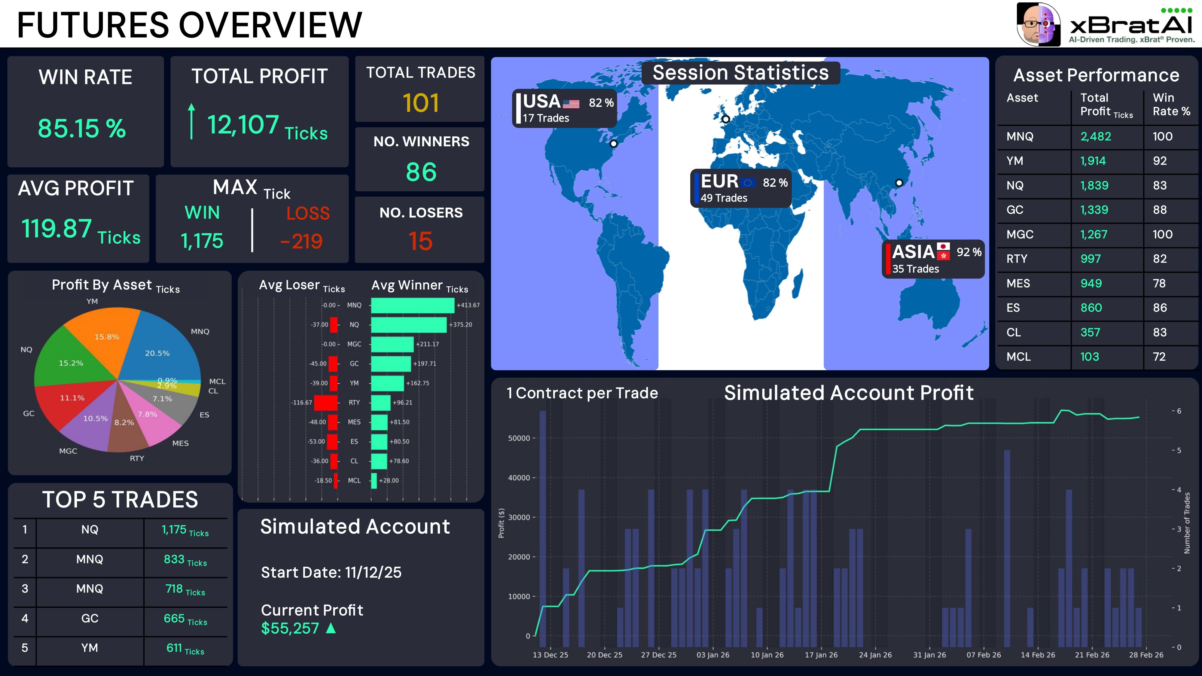 Futures completed 101 trades with an 85.15% win rate and 12,107 total profit ticks, equating to $55,257 using one contract.