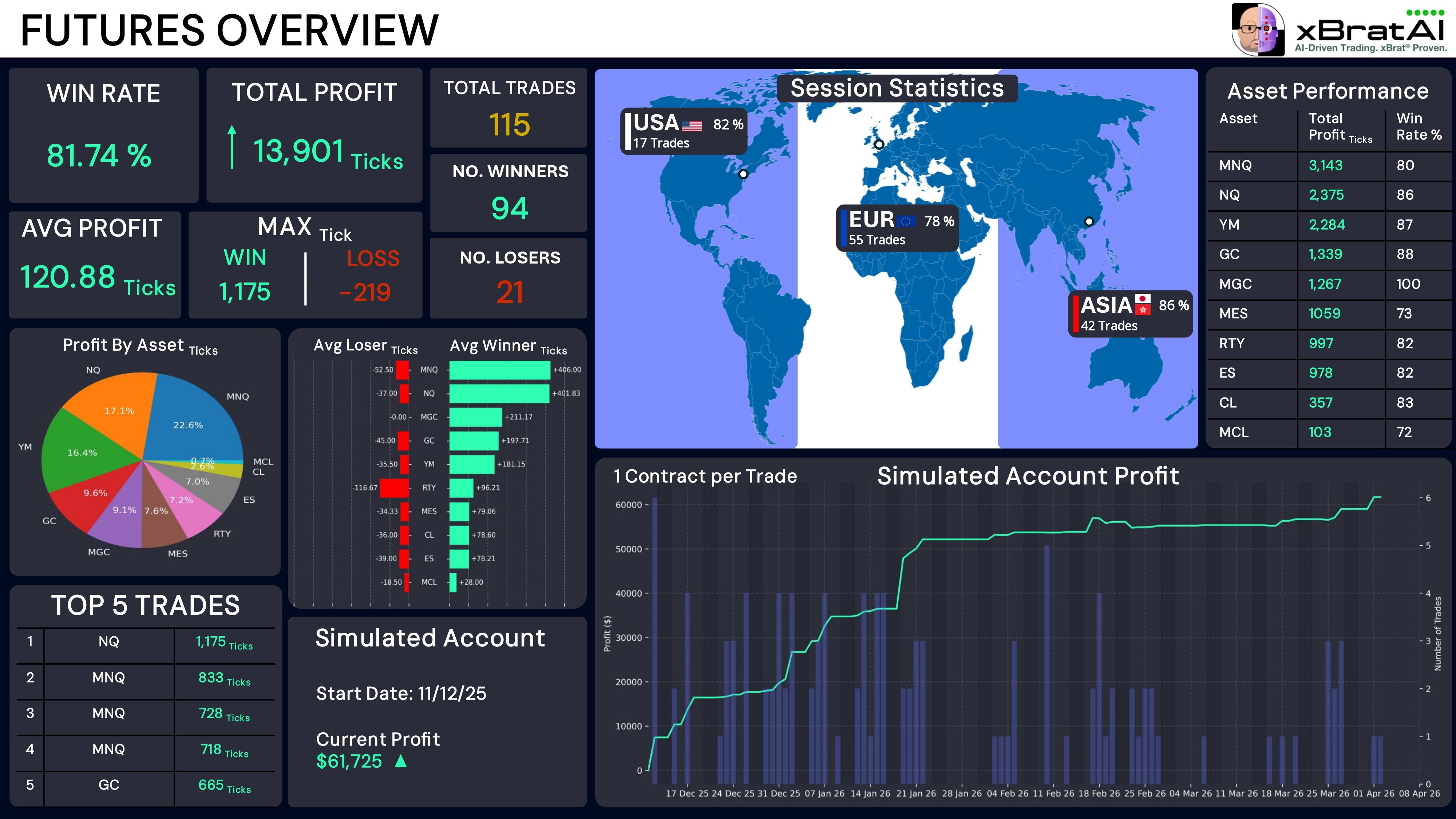 Futures completed 118 trades with a 79.66% win rate and 13,739 total profit ticks, equating to $60,405 using one contract. Following last week's strong performance, Futures saw a pullback of $1,320 in simulated profit as market conditions tightened across the week.