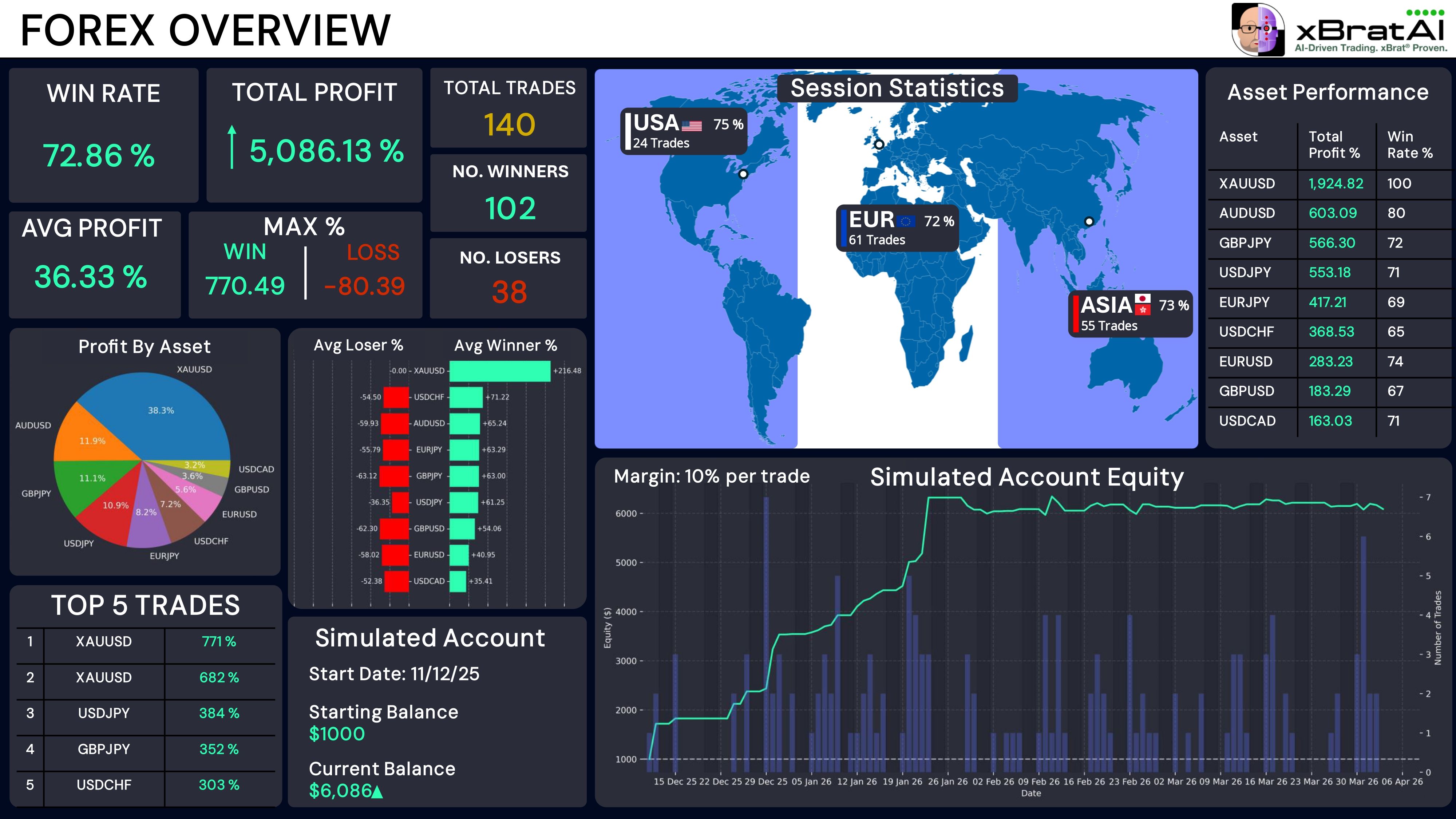 Forex completed 140 trades with a 72.86% win rate and 5,086.13% total profit. A simulated $1,000 account reached $6,086 as trade count expanded. Performance remained broad across major pairs and Gold with results recorded across USA, EUR, and ASIA sessions.