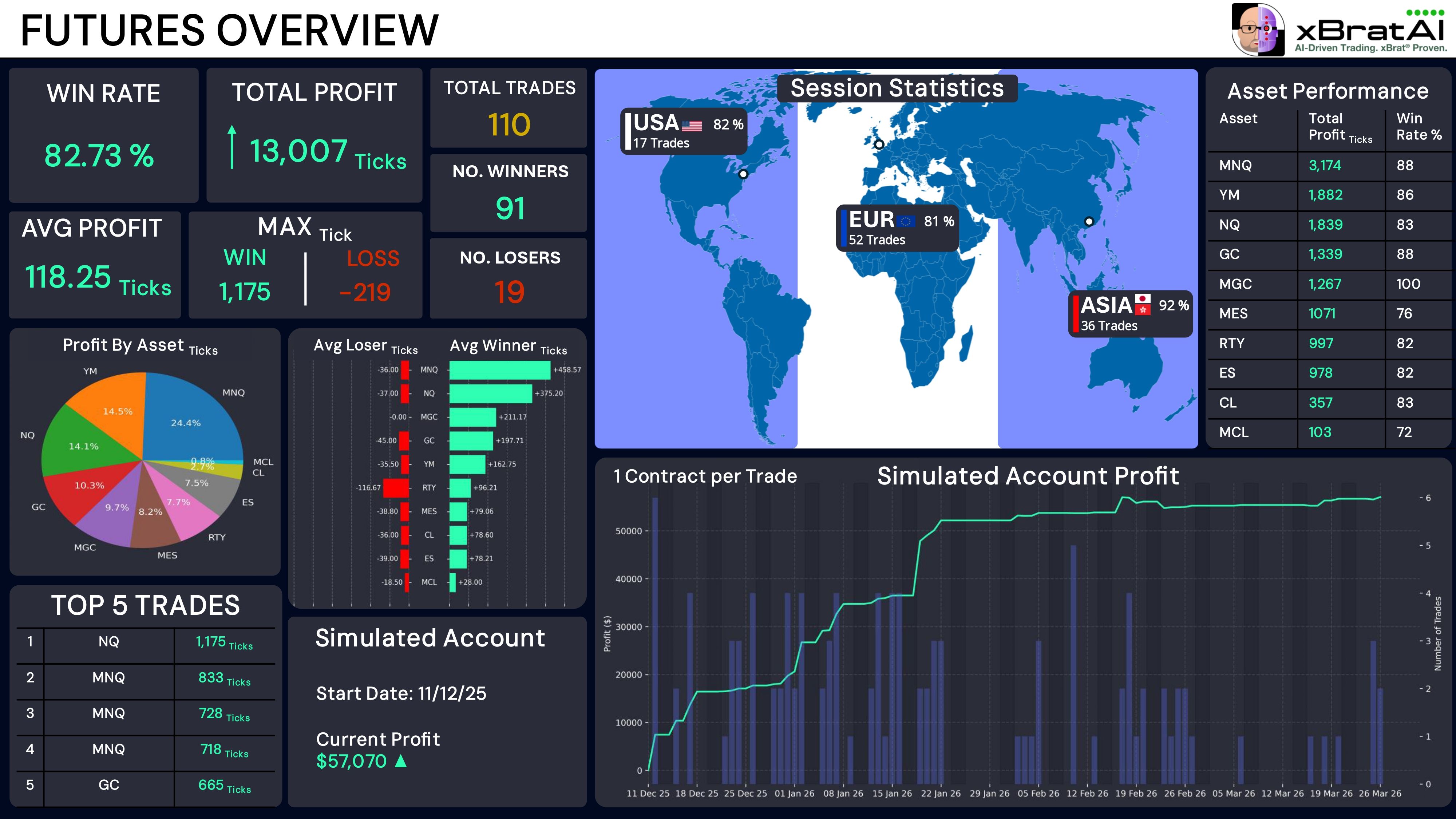 Futures completed 110 trades with an 82.73% win rate and 13,007 total profit ticks, equating to $57,070 using one contract. Futures recorded the highest win rate across all three markets with consistent performance across all sessions.