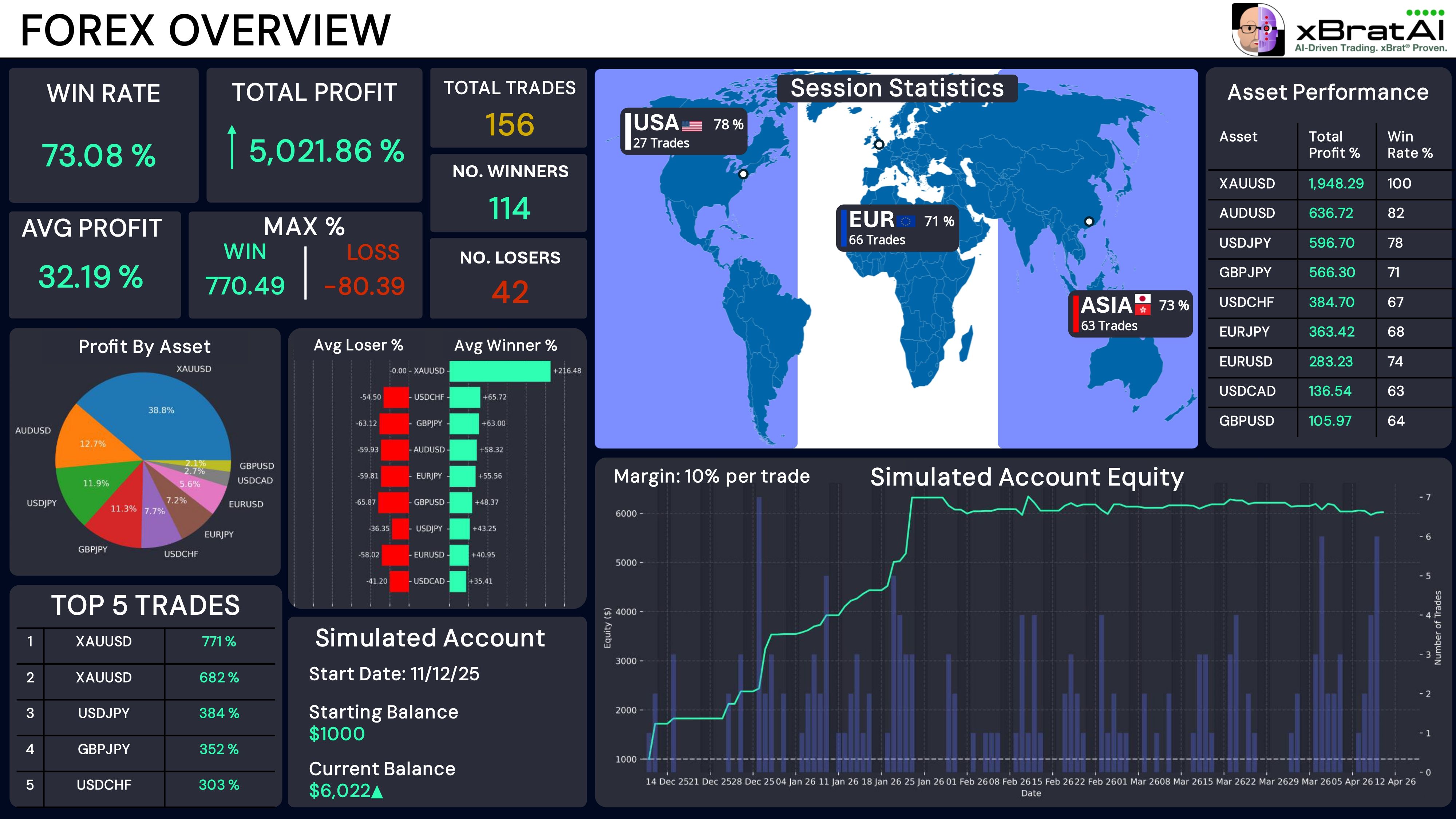 Forex completed 156 trades with a 73.08% win rate and 5,021.86% total profit. A simulated $1,000 account sits at $6,022 as trade count expanded. Performance remained broad across major pairs and Gold with results recorded across USA, EUR, and ASIA sessions.